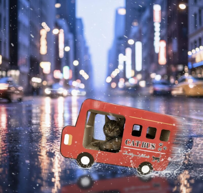 今日は、愛猫こむぎが「CAT BUS」に乗って夜の街を走り抜けるAI画像をご紹介します。