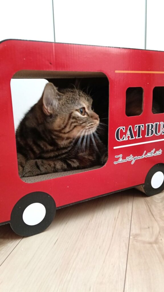 “ただの爪研ぎ”が“こむぎの冒険バス”に早変わりしました。