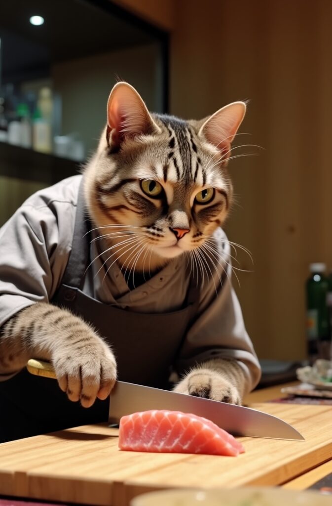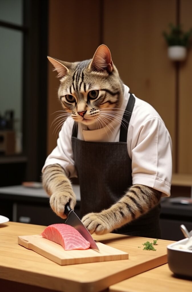 まさか、いつものんびりお昼寝したり、おもちゃと格闘したりしている我が家のこむぎが、こんなにも凛々しい板前さんに変身するとは…!こむぎパパも、生成された画像を見て思わず「おおっ!」と声を上げてしまいました。これなら、どんな難解な魚でも見事に捌ききって、最高に美味しいお刺身を提供してくれるに違いありませんね。
