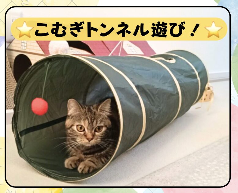 動画では、こむぎがキャットトンネルの中を激しく動き回る様子が映されています。トンネルの内壁をかすめながら、ジャンプしたり、隠れたり、探検したりする動きがとても生き生きしています。